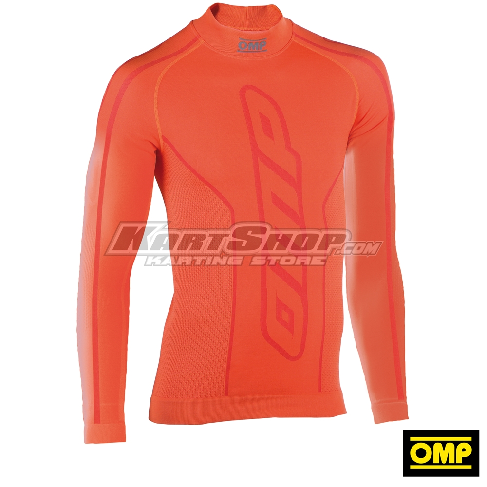 This long-sleeve undersuit top from OMP is designed for karting, featuring a seamless elastic construction that efficiently wicks sweat away from the body and provides comfort in cooler track conditions.